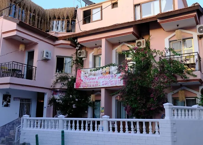 Hotellet Yesim Pansiyon Çeşme, som ligger mindre än 5 minuters promenad från Kafe Pi Beach Club, erbjuder 6 rum med utsikt över staden. Gästerna på detta hotell kan upptäcka Ayayorgi Koyus strand, som ligger cirka 2 km bort, eller promenera i bara 6 minuter till Cesme Anfi Theatre.